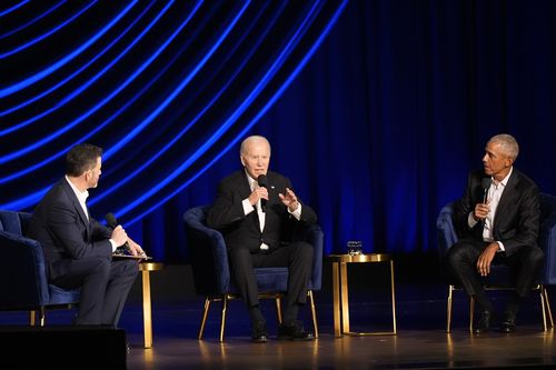 Hollywoodski A-listeri vrátane Jimmyho Kimmela hostili Bidena a bývalého prezidenta Baracka Obamu na finančnej zbierke v Los Angeles pred niekoľkými týždňami. (AP)