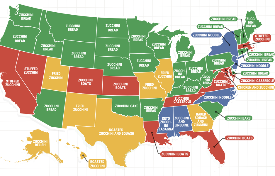 Všetky rozumné otázky. Podľa Googlu vyhľadávanie cukiet v USA zvyčajne vrcholí v auguste so zeleninovou sezónou. V máji však ľudia začnú myslieť na cuketu. Podľa Googlu v tej dobe ľudia začali vidieť, „ako pestovať cuketu“. Väčšina Kalifornie a Floridčanov hľadá recepty na plnené cukety, zatiaľ čo ľudia na severozápadnom Pacifiku, v Novom Anglicku a na Stredozápade hľadajú dobré recepty na cuketový chlieb.