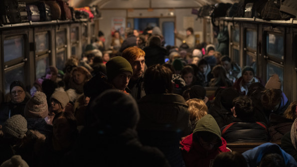 Ukrajinci vysídlení vlakom do Poľska v nedeľu 13. marca v západoukrajinskom Ľvove. AP